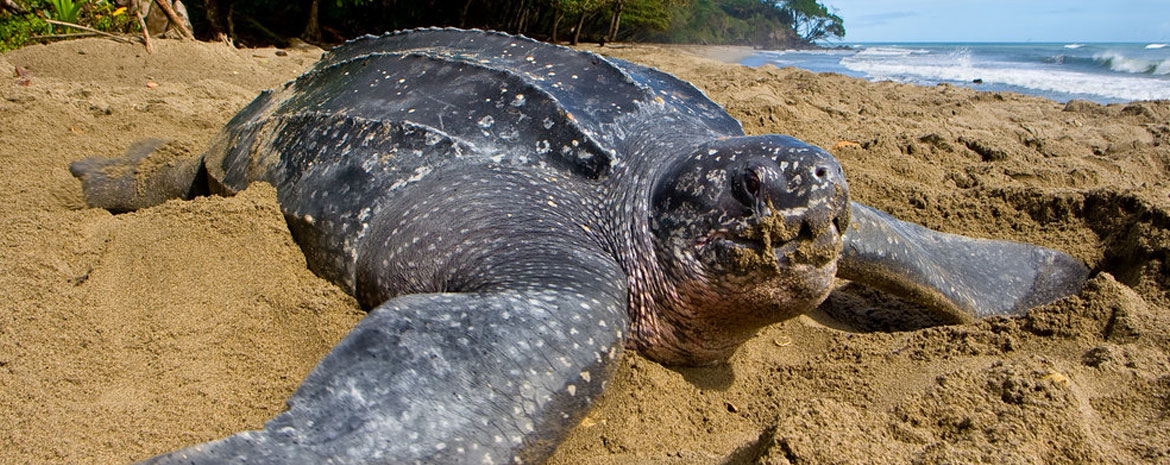 The leatherback sea turtle is the most unique of all sea turtle species. As the only living member of the family Dermochelyidea, they are the largest living turtle species and have the greatest migratory distribution of any reptile on the planet. Its distinguishing feature is its carapace, which has a smooth, leathery skin that covers a flexible matrix of bone. This carapace is highly specialized for diving to extreme depths of up to 4,000 feet (1,219 meters). In addition, a unique thermoregulatory adaptation allows leatherbacks to maintain core body temperatures at these extremely cold depths.